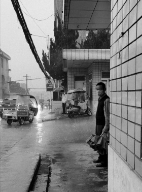 和朋友出去玩的时候,突然下起了大雨,在一个屋檐下躲雨,抓拍到的瞬间。