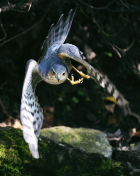 雀鹰捕食时,冲镜头飞来。