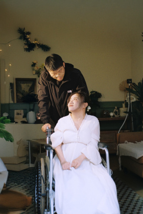 她坐在轮椅上,